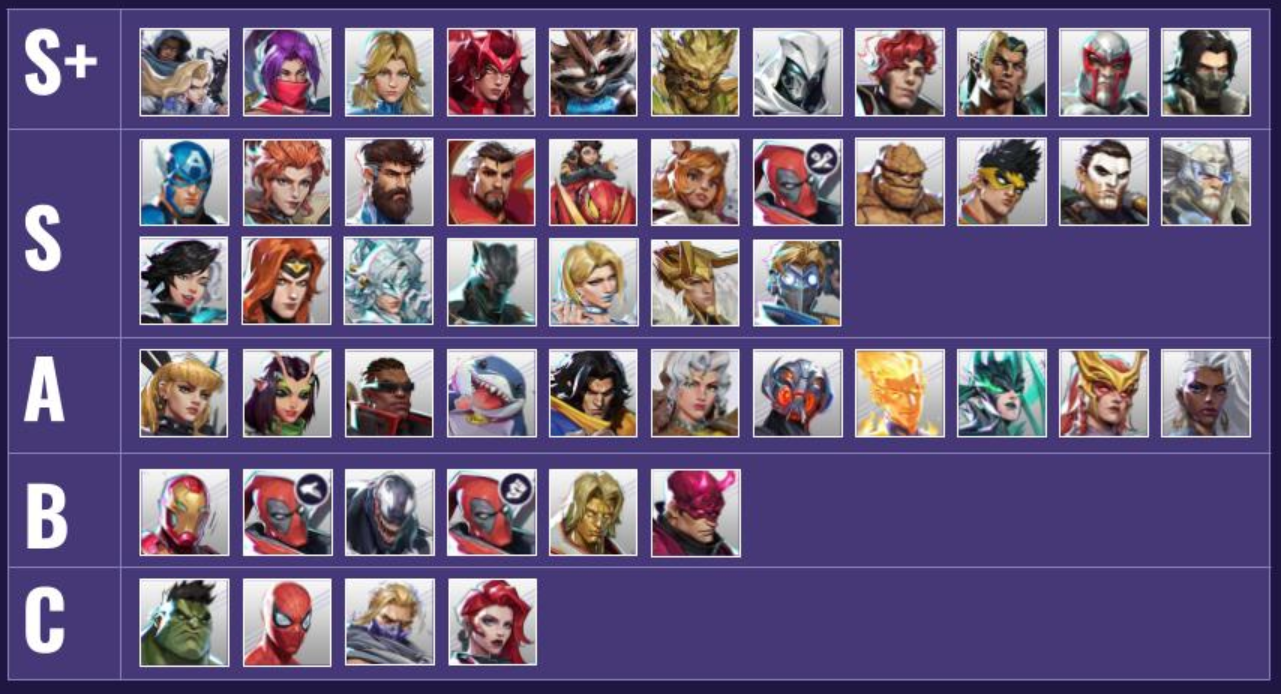 The list usually divides heroes into S+, S, A, B, and C tiers. This system helps players quickly understand power levels and priority picks. Every marvel rivals tier list uses these grades to compare hero value.